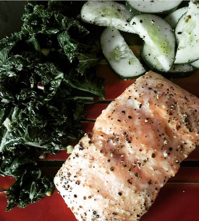 - My dinners were the same each night – slow-roasted salmon, sauteed kale, seasoned cucumber