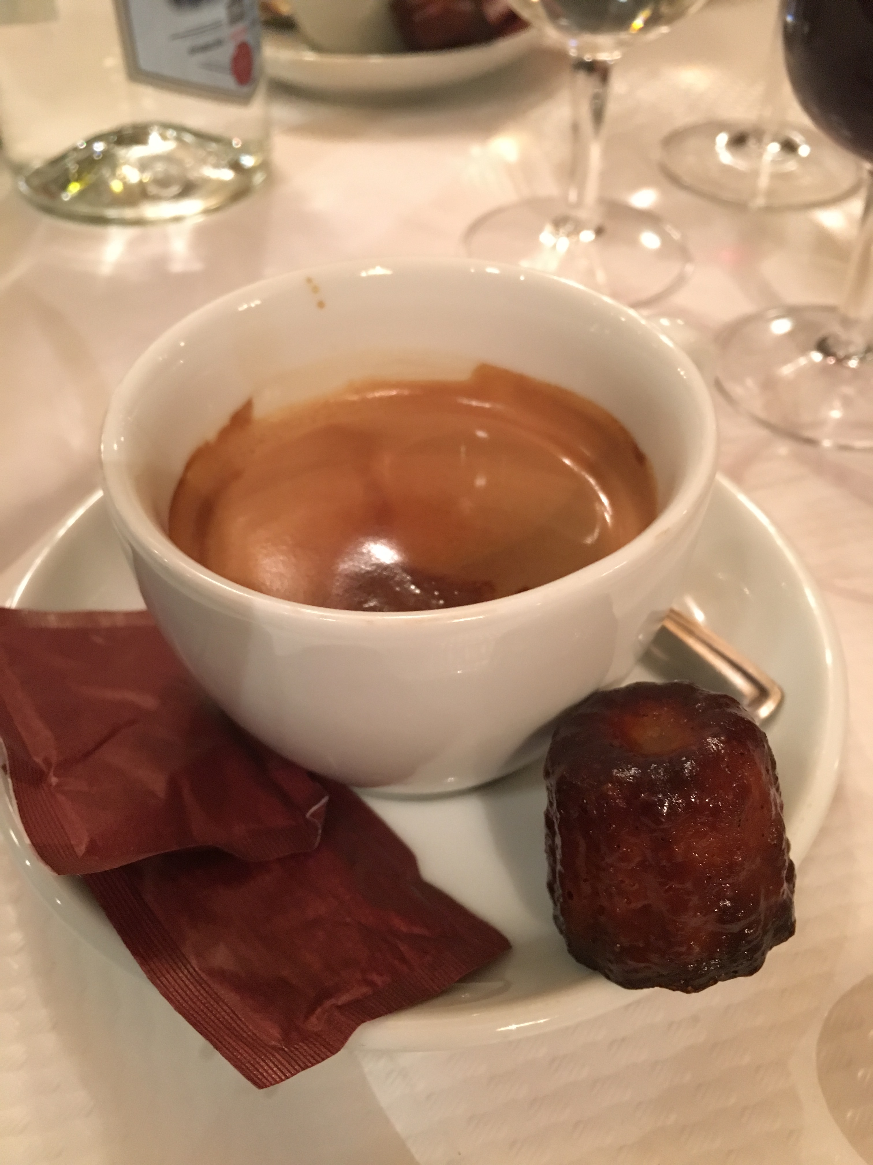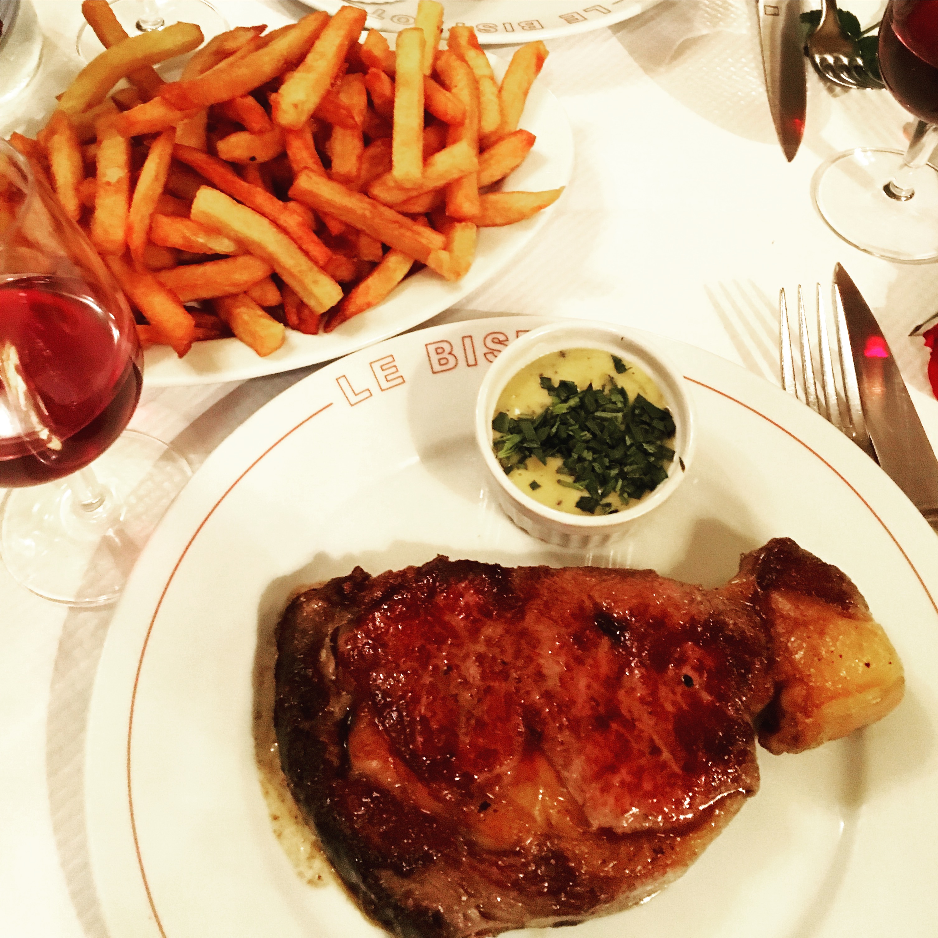 For the main course, or “plat” in French, we both made the easy choice – steak & frites. In this case, it was the entrecôte, served with crispy frites, and a bearnaise sauce. Our server also said two magic words – bone marrow. Yes, you could have roasted bone marrow as a “sauce”. Yes, please! Now, if you haven’t had roasted bone marrow yet, please get it during your next steakhouse or bistro visit. And, if you can have it as an option with your steak, do it. The marrow melts like beefy butter onto a hot steak and it is truly freakin DIVINE.