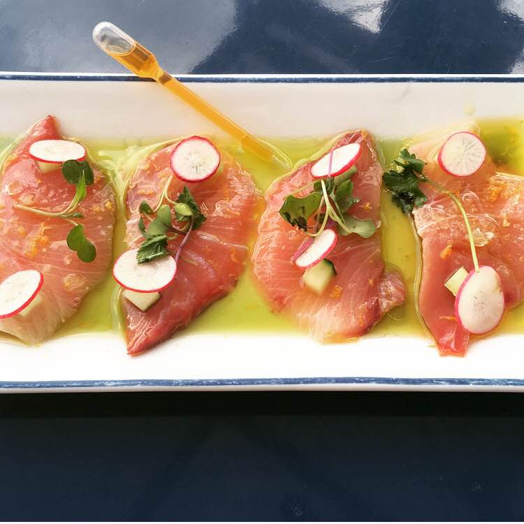 HAMACHI CRUDO | spicy citrus oil, radish, microgreens