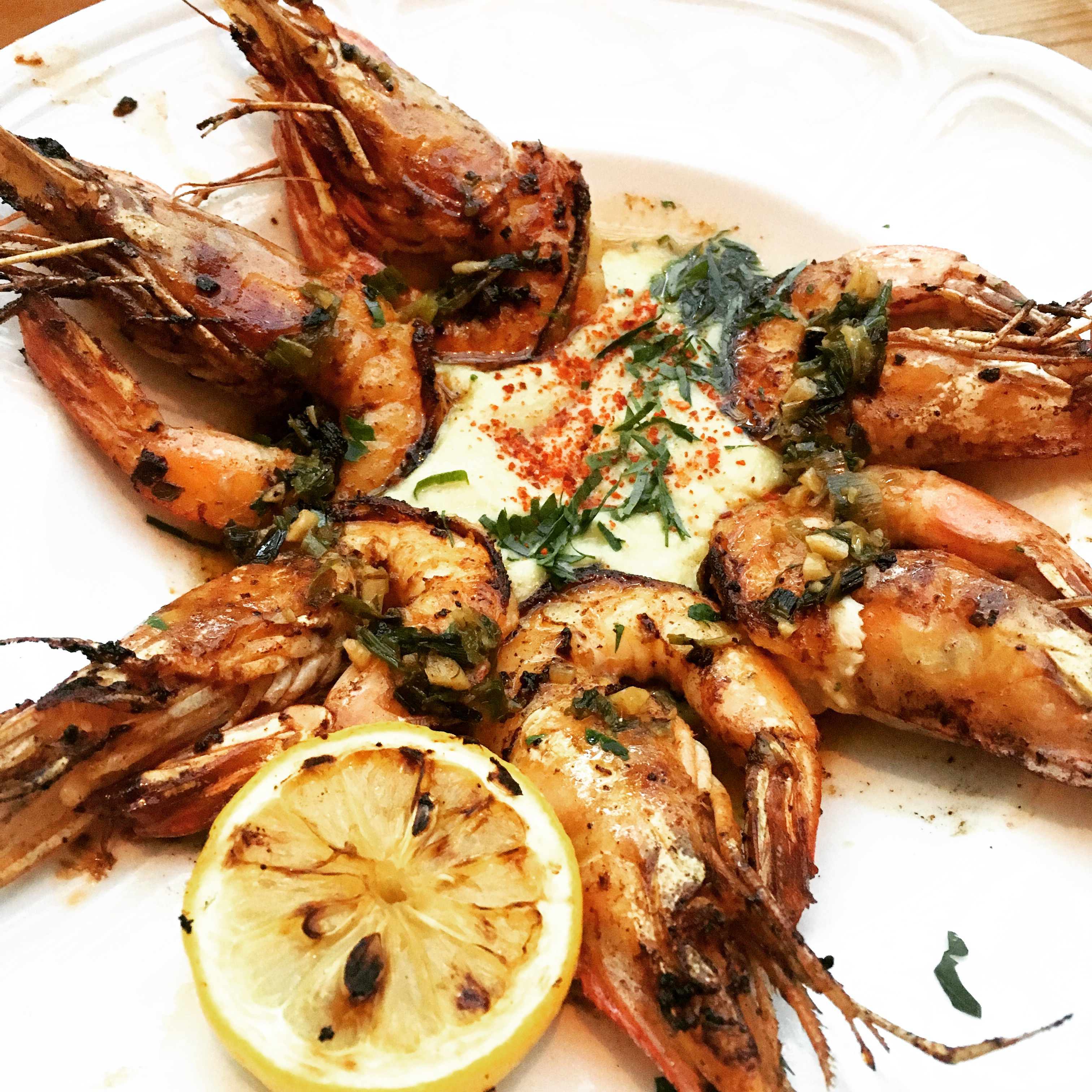 SHRIMP A LA PLANCHA | charred scallion and marcona almond pistou, sweet garlic puree, grilled lemon