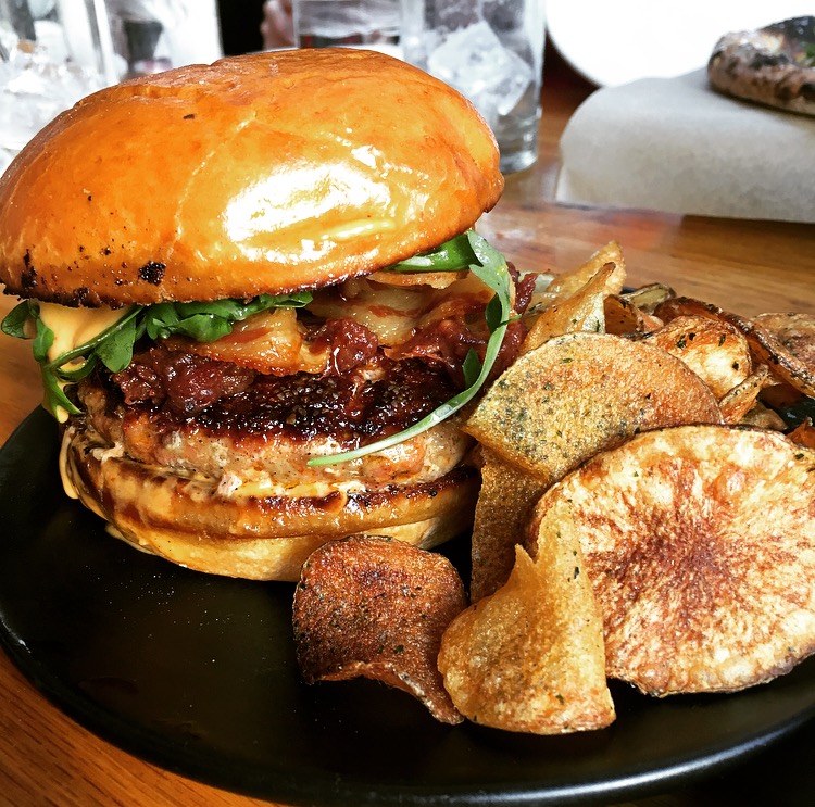 AVEC BURGER | chorizo and beef burger, bacon, date mostarda, piquillo pepper aoili