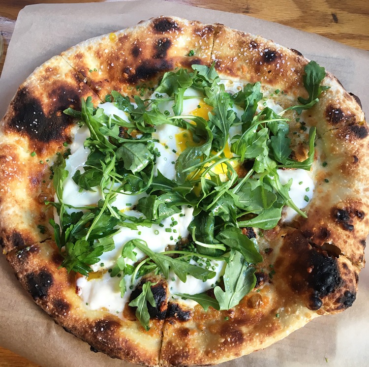 PIZZA CARBONARA | guanciale, roasted garlic, arugula and an egg