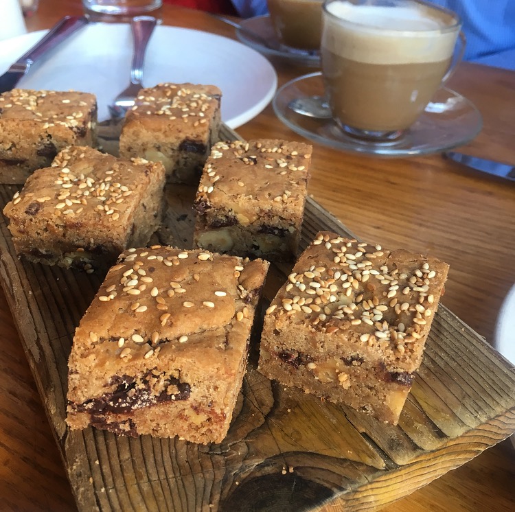 You’d think that after all of these dishes, we’d be too full for dessert. Never. There’s always a tiny bit of room left for something sweet at the end of the meal. We decided to share the French Toast, then ordered a latte or two along with these sesame blondies. It was the perfect ending to a perfect brunch.