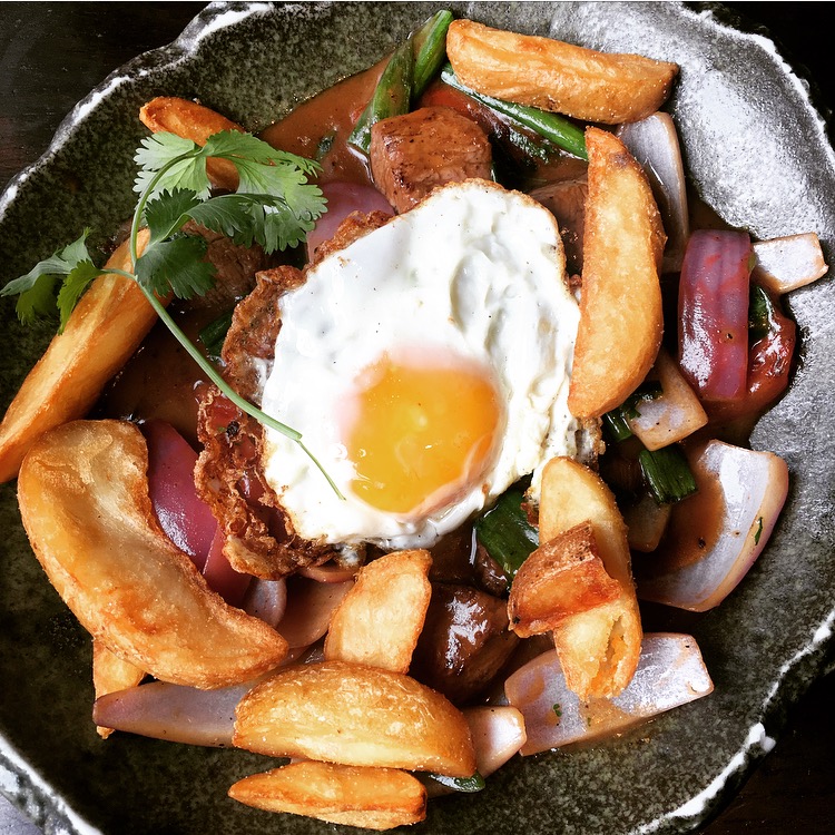 LOMO SALTADO | tenderloin, red onions, tomatoes, garlic-soy sauce, rustic potatoes, arroz con choclo