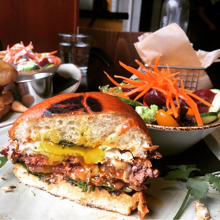 BURGER ANTICUCHERA | 7 oz beef patty, anticuchera sauce, gruyère, fried egg, rocoto sauce, brioche bun