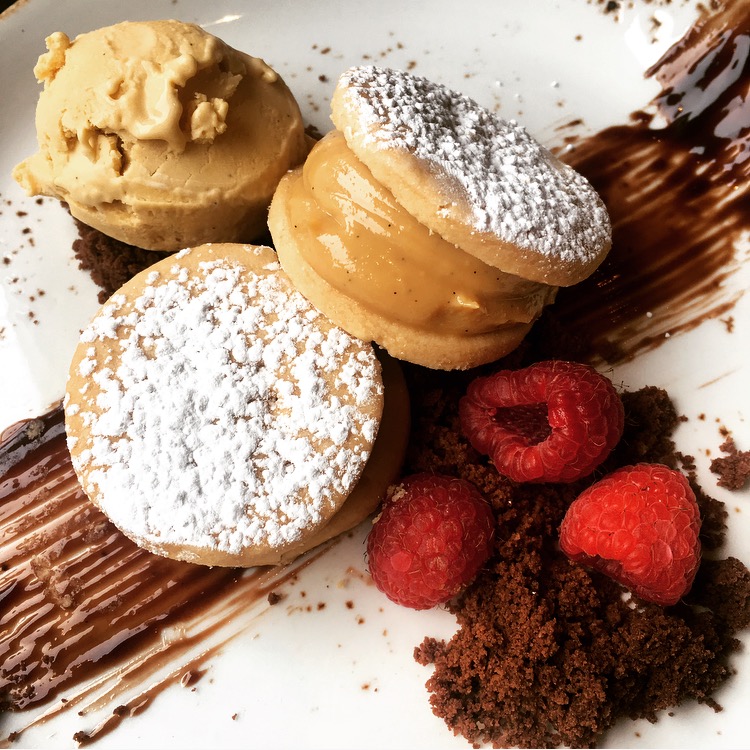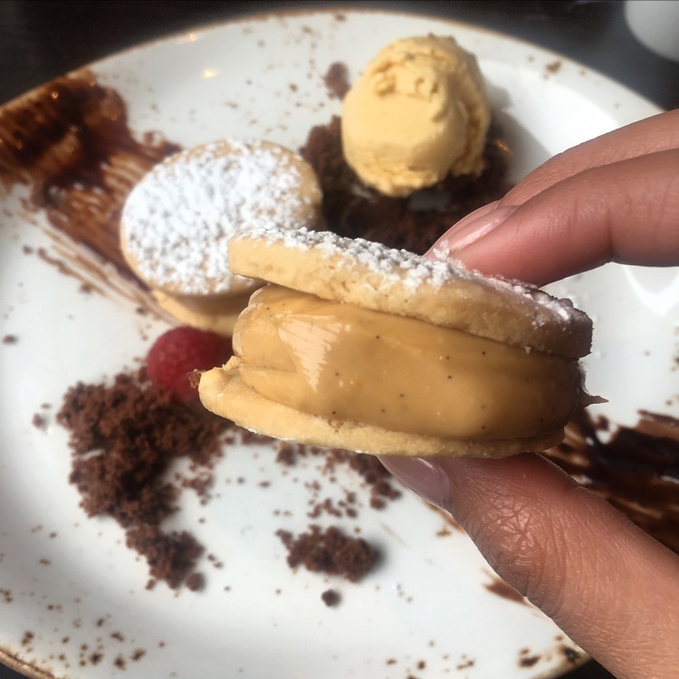 DUO DE ALFAJORES | vanilla & chocolate shortbread cookies, dulce de leche center, lucuma ice cream